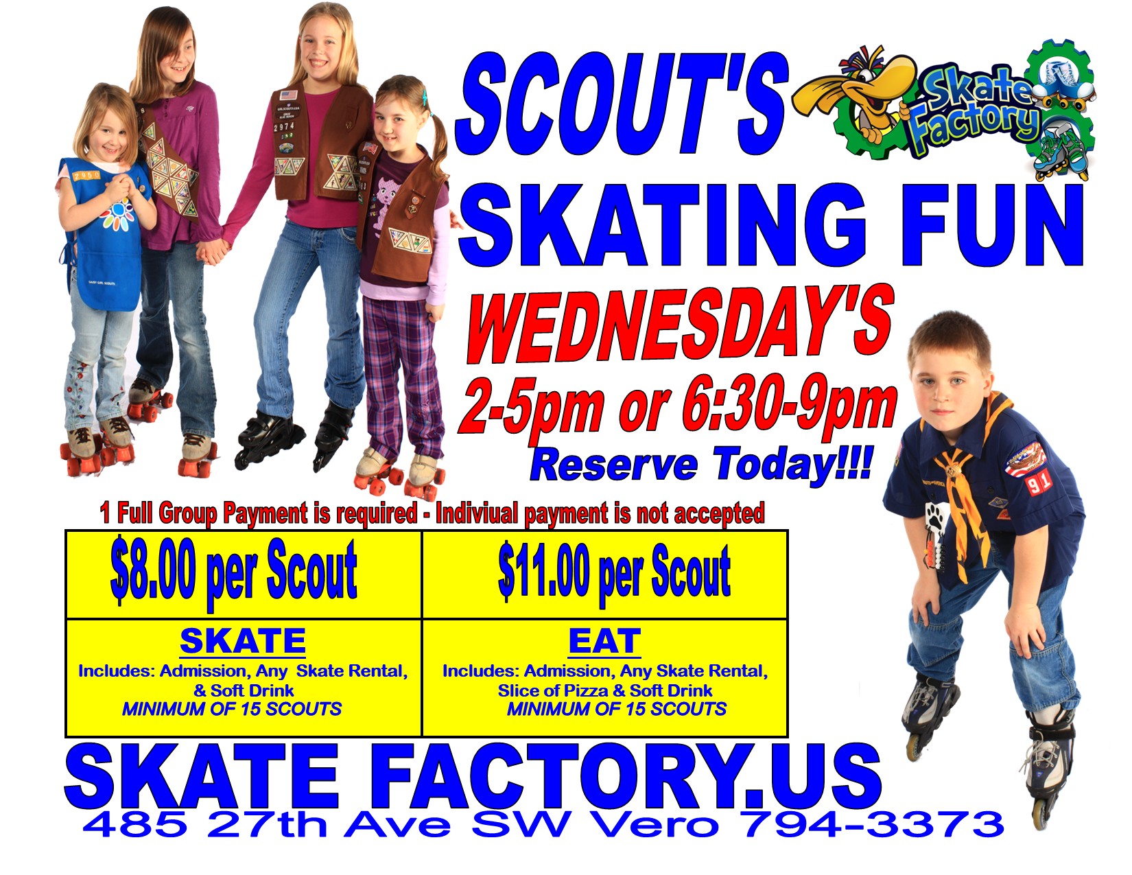 Wednesday is a great for your club or scouts to visit Skate Factory.